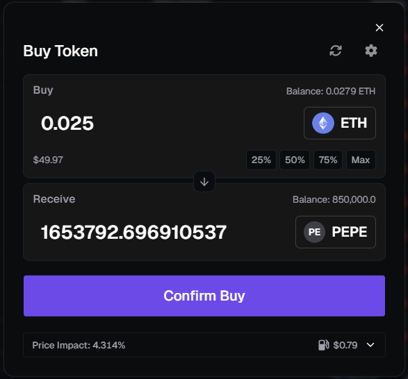 * **Price Impact**: Shows the price impact of your buy on the overall token price, allowing you to gauge the effect of your transaction on the market.