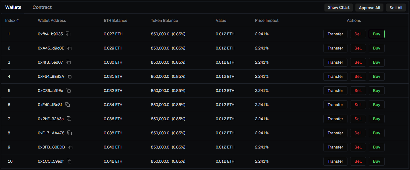 To initiate a buy, select the **Buy** button in the **Actions** column next to the wallet you want to buy with. This will open the **Buy Token** modal, where you can enter the amount of ETH to buy with and review your transaction.